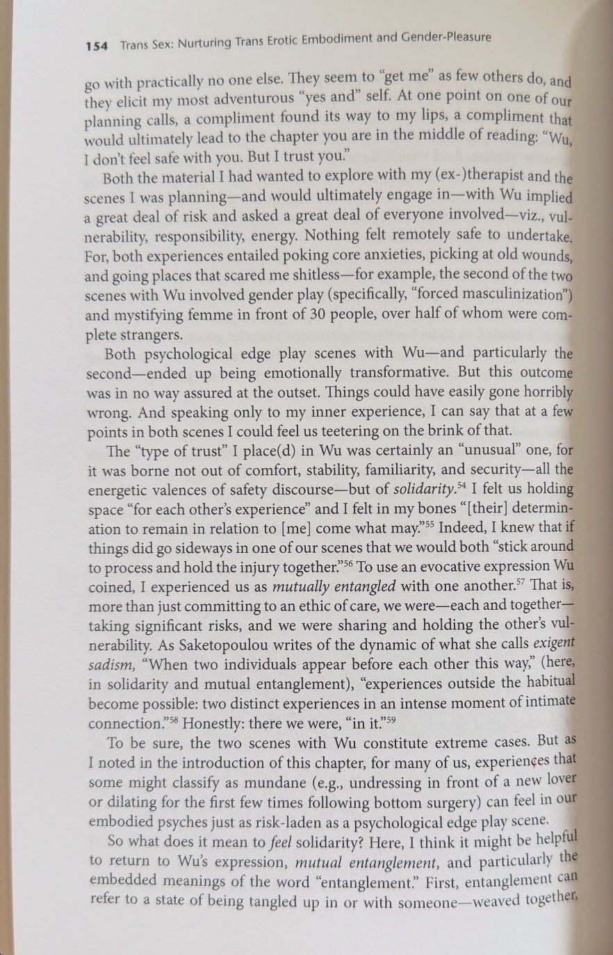 If you are reading this, I highly, highly, highly recommend grabbing yourself a copy of the second edition of Trans Sex, no matter how you identify, as it methodically outlines thinking about sex differently, thinking of your body differently, thinking beyond the typical emotional and physical scripts of sex, which is what kink is all about too in my very humble opinion.